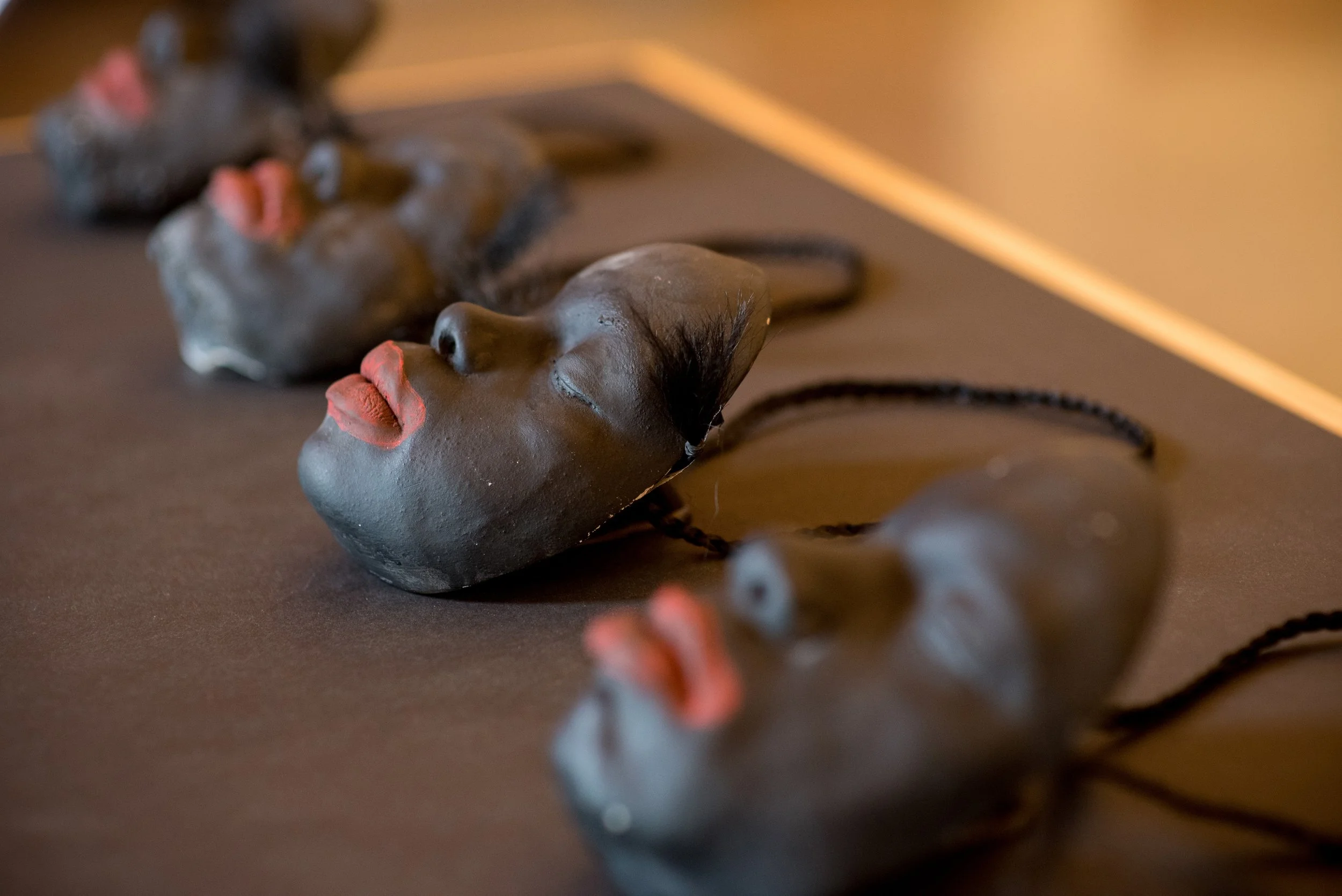 Unwearable (Defence/Offence) is a sculpture installation that consists of 12 black, two-sided masks placed on metal poles arranged in a straight line. The masks will be back-to-back replicas of the faces of volunteers who identify as Black. These two-sided masks disallow people from putting their faces into them, thus symbolically resisting Blackface by making the Black face unwearable. The work functions as a mark of resilience, making Blackness visible on campus without allowing it to be made a caricature.